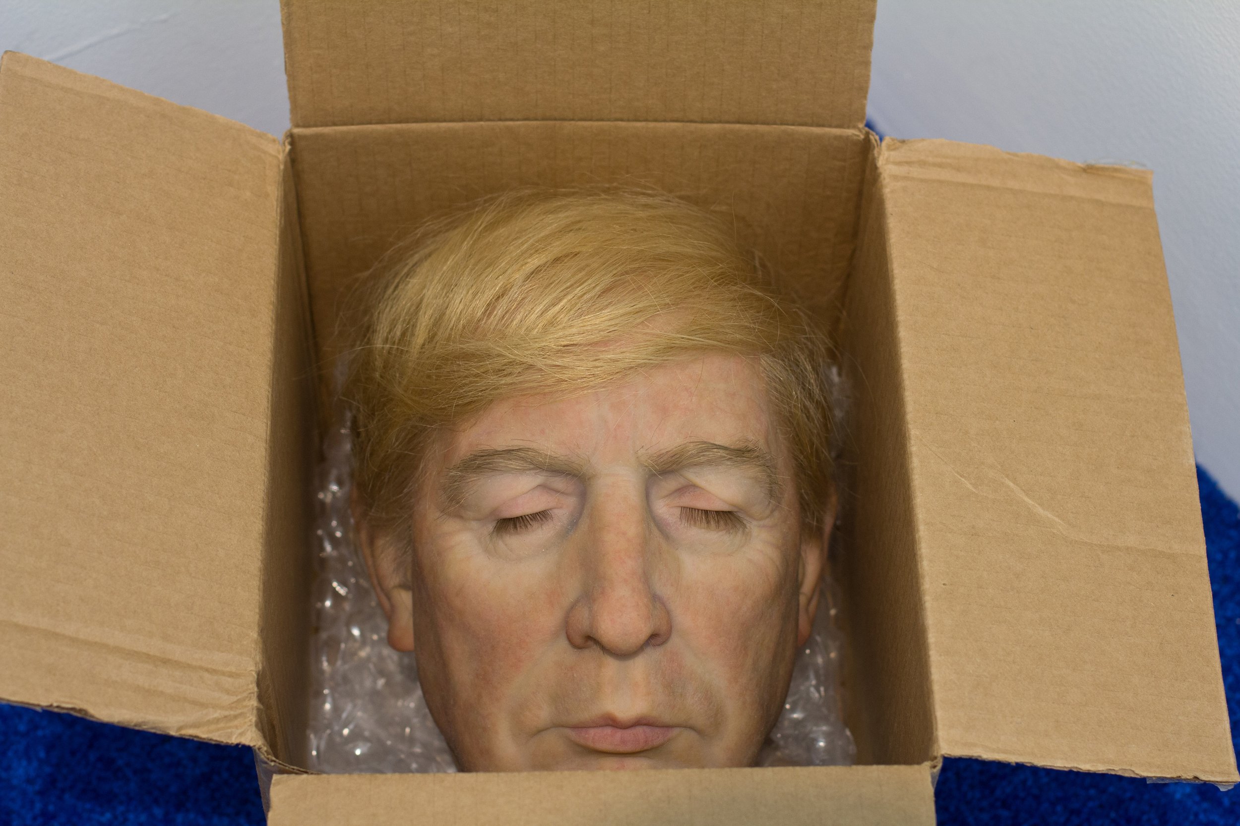 Such a system germinates and feeds leaders who are elected only for their own benefit. It is a (self) delusion to think that we can be part of decision-making with our ballots. The real truth is that those decisions have been already made and our votes are just an act to satisfy the masses. Tackling these themes of politics, religion, and socioeconomic standards, with the aim of satirically questioning their validity, Merino presents Pandora’s Ballot Box, a methacrylate ballot box containing ballot papers and the head of Adolf Hitler. Known for his Hyperrealist sculptures – including dictators, politicians, artists, and other institutionalized figureheads – Pandora’s Ballot Box is among the artist’s most poignant and controversial works to date. It should not be forgotten that Hitler used democracy – using a strategy comparable to a coup d’état – to rise to power. As such, Pandora’s Ballot Box is a nod to the growing rise of extremism in Europe and the United States through representative elections. The resonance of this work is further accentuated when viewed with Damaged Goods, a life-size sculpture of Donald Trump’s head, complete with his signature hairstyle, detailed to every strand.