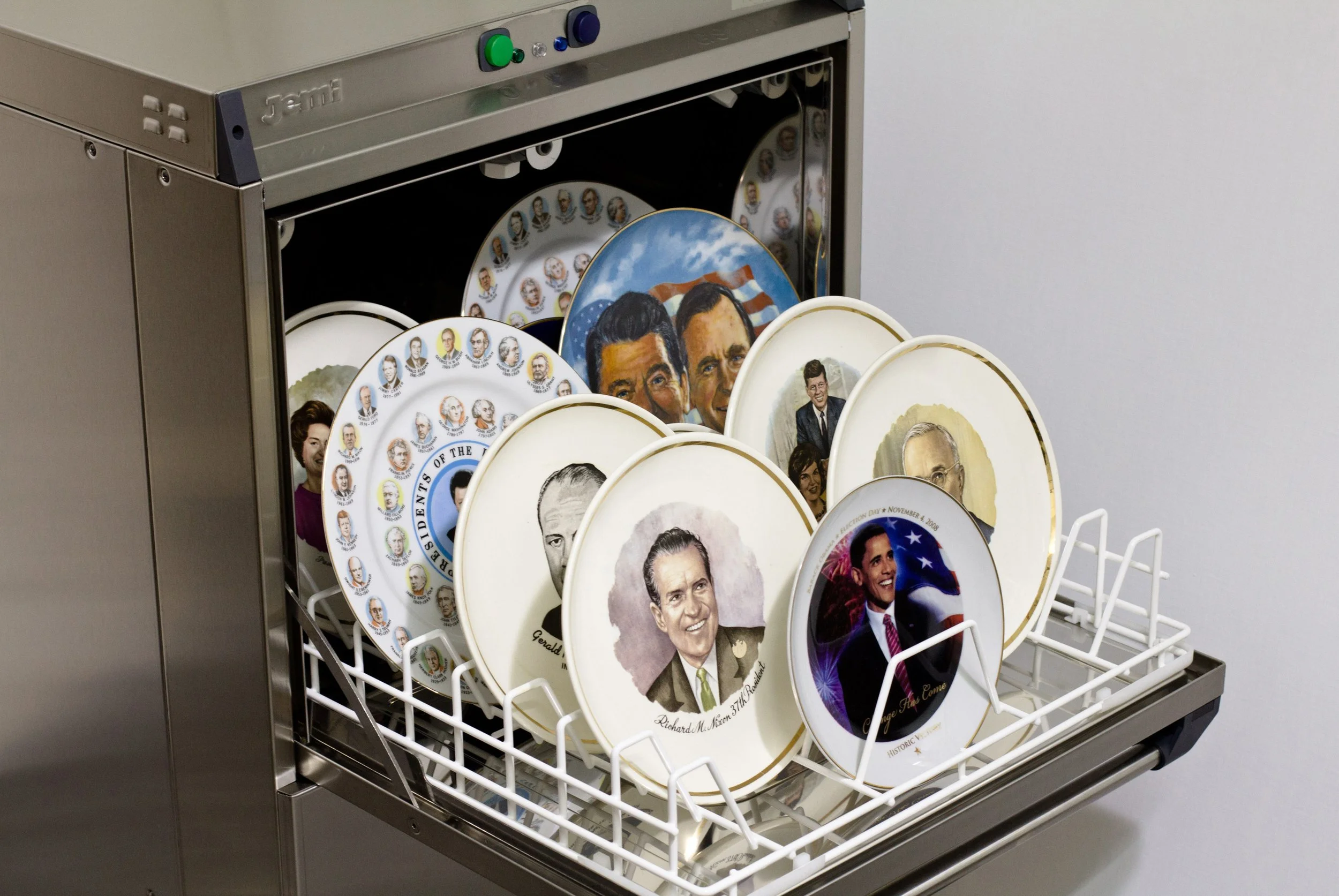 Merino posits that together politicians change, as the world evolves, but the majority of the social class struggles is still the same. “The best slave is the one who thinks he is free.” This quote by Johann Wolfgang von Goethe reiterates Merino’s idea in the artwork Face Wash. Mixing elements of objet trouvé and sardonic conceptualism, the artist loads commemorative plates featuring American presidents into an industrial washing machine. Merino speaks of power, capitalism and, of course, of submissive automatons, exploring the decades-long proliferative collusion between Big Business and Big Government. Replete with political imagery and motifs, Merino presents a contemporary cautionary tale rooted in the denial of individual freedoms and democratic right under the guise of “managing society” by a new and more opaque fascism. Moreover, Face Wash addresses the interchangeability of politicians. Like the plates that bear their portraits, these leaders are mere ornamentation; puppets for a larger apparatus in which both they and average citizens get wrapped up. Merino presents a contemporary cautionary tale rooted in the denial of individual freedoms and democratic right under the guise of “managing society” by a new and more opaque fascism. There is a cycle of washing away the same sociopolitical issues that burden our society, just to repeat and further these mistakes.