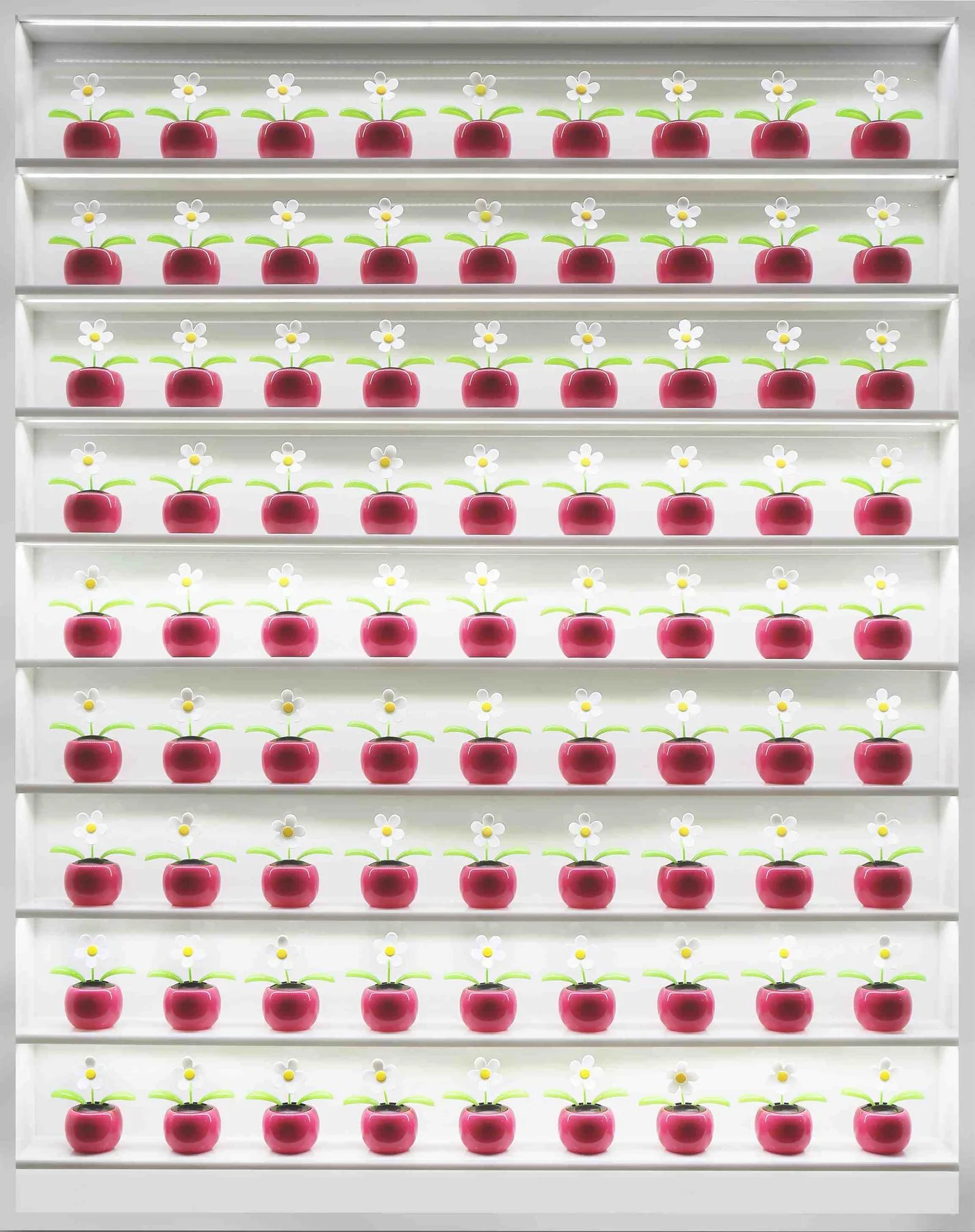Jonathan Paul’s (aka Desire Obtain Cherish) body of work explores the decision-making process we undergo while chasing the elusive state of happiness. This cultural commentary is echoed in his Happiness Guaranteed series, which features inorganic, kinetic flowers powered by solar panels. Uniquely arranged, these solar flowers react to the artwork’s embedded LED lights resulting in a gyrating symphony for the eyes.