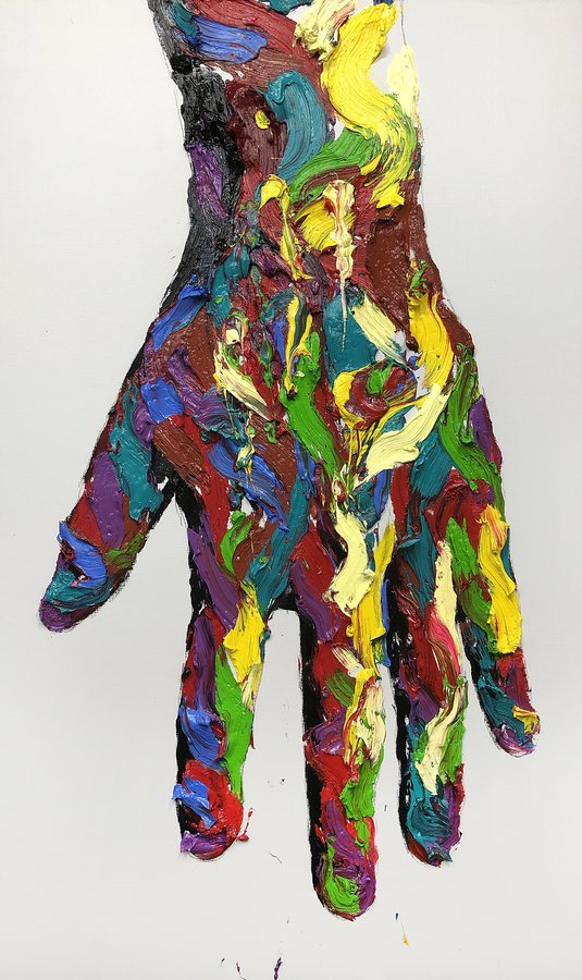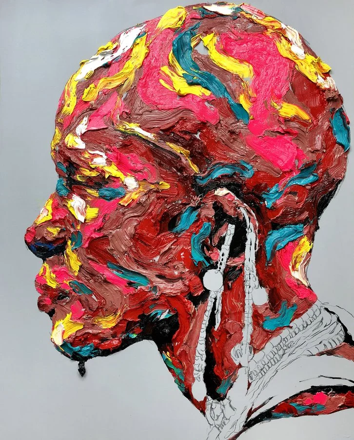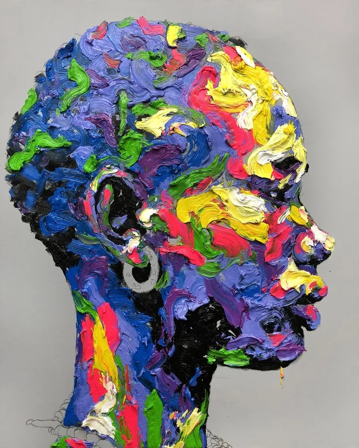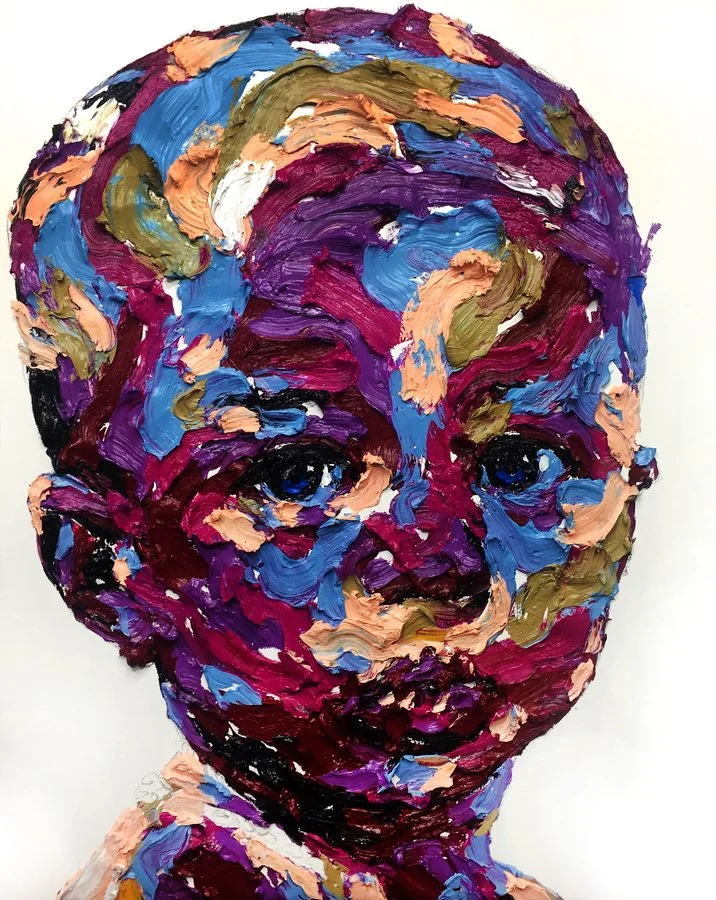 Inspired by Abstract Expressionism, he uses oil paint in his unique way to highlight the possibilities of portraiture in the digital age. Thick oil impasto swirls in vibrant colors reveal both bright pop-art explosions and a darker distorted side of the human psyche.