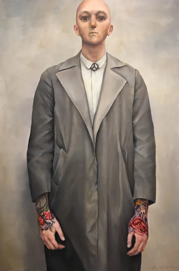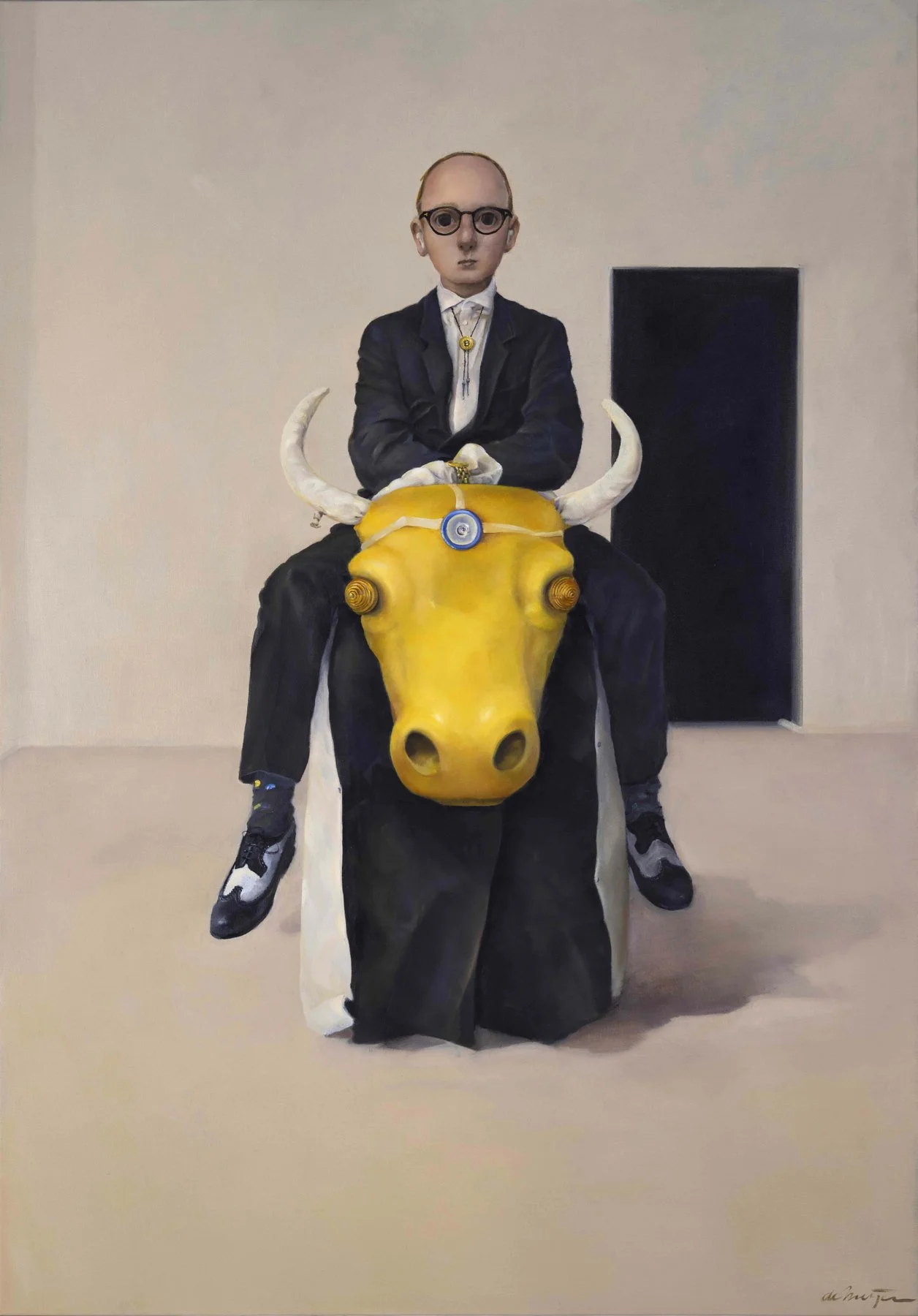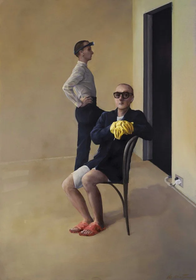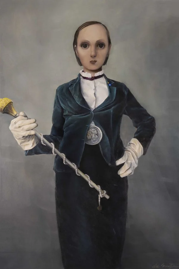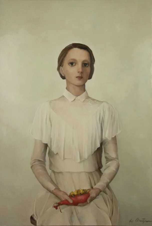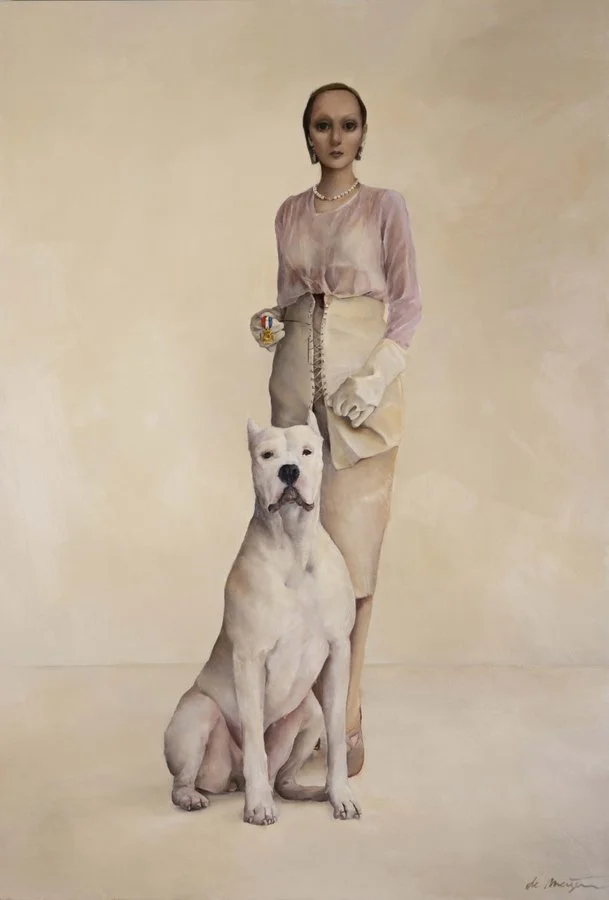 Ellen de Meijer is known for a distinctive style of painting that explores the ways in which information can be embedded within certain scenes and signifiers. Her works are rendered in a muted palette, yet their quiet and restrained appearance belies an underlying moral complexity. De Meijer depicts a pervasive social behavior that she calls Kitsch – with manifestations of wealth, consumerism, and the importance of status and possessions. Kitsch is the lipstick of society. You, me - we’re all part of this circus. All of us have agreed to keep up with our harmful and fake appearances, – says the artist. The universal archetypes that inhabit her paintings appear harsh, egocentric, and even Darwinist, while simultaneously seeming helpless and lost. Yet, her depictions of women often show characters that are powerful and in control. Her most recent painting High Profile portrays a strong and successful businesswoman with her dog, where the woman is shielded by her companion friend. In this work de Meijer uses white tints of paint to represent the sense of emptiness. The corset signifies an uptight nature of the woman, but the fact that it’s not fully closed is suggestive of her willingness to open up.