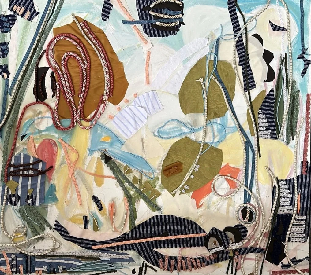 Her work unfolds at the intersection of gesture, texture, and color. Collage, fabric, and fibrous materials mingle with oil, acrylic, and charcoal to generate compositions that are at once dissected and whole—elegant yet unrestrained. These tactile dialogues mirror the dualities of daily life and caregiving, infusing the work with a visceral intimacy. At the heart of her practice lies an enduring exploration of femininity—its histories, burdens, and spiritual resilience—expressed through a fearless embrace of materiality and color.