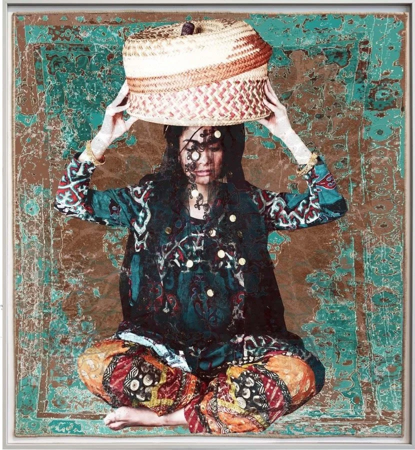 Al Nemer, born in Al-Qatif, Eastern Province, builds upon folklore, social heritage, and the legacy of women as cultural anchors. Through visual art, multimedia, collage, and her innovative textile-printing techniques, she reclaims and reanimates historical and cultural narratives. Often placing herself at the center of her canvases, Al Nemer embodies figures of strength, myth, and memory, fusing past and present into a singular visual identity. Her works celebrate women not only as subjects of heritage but also as active creators of it, reshaping tradition into a living, breathing force.