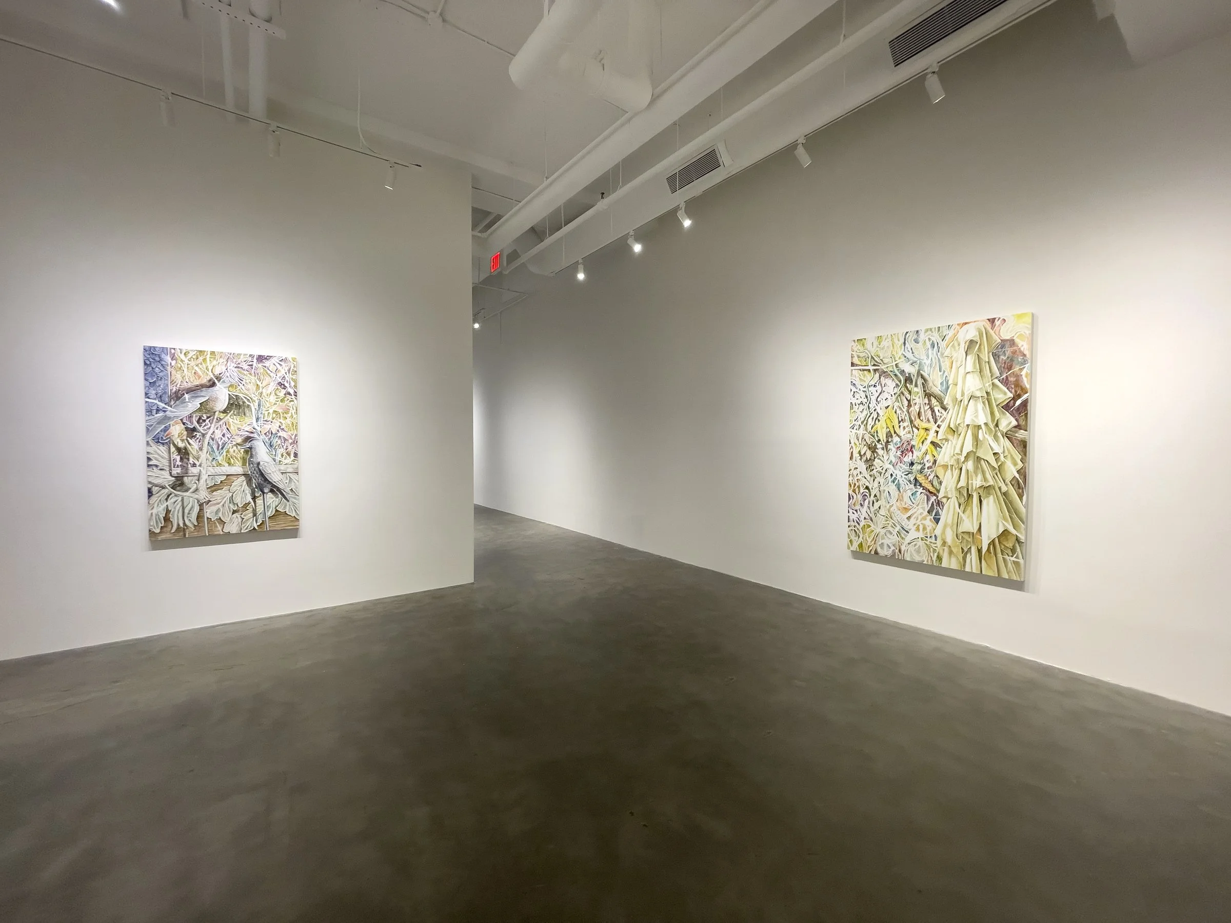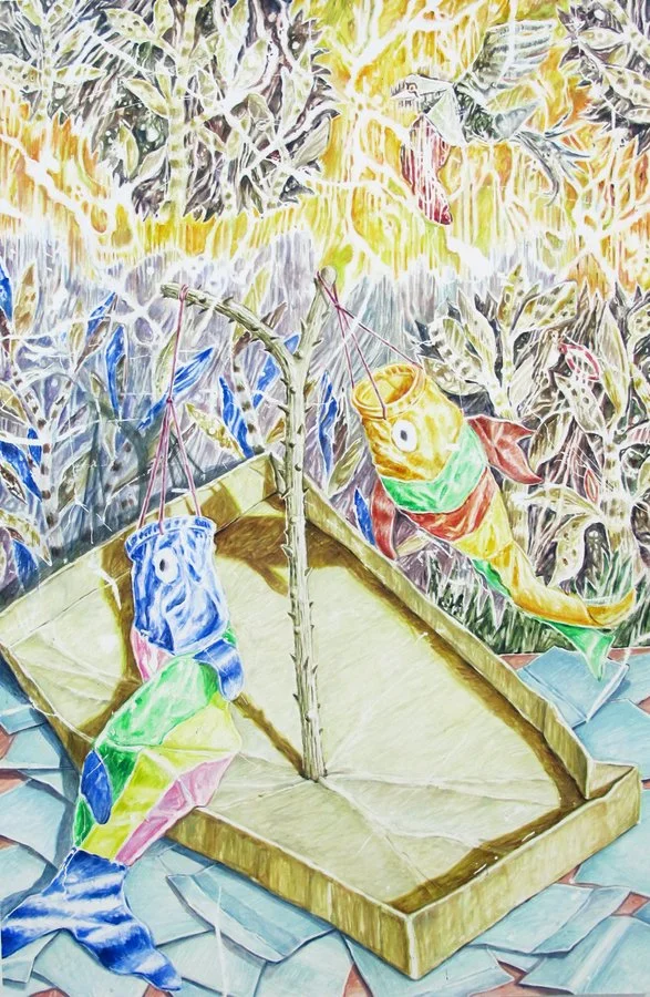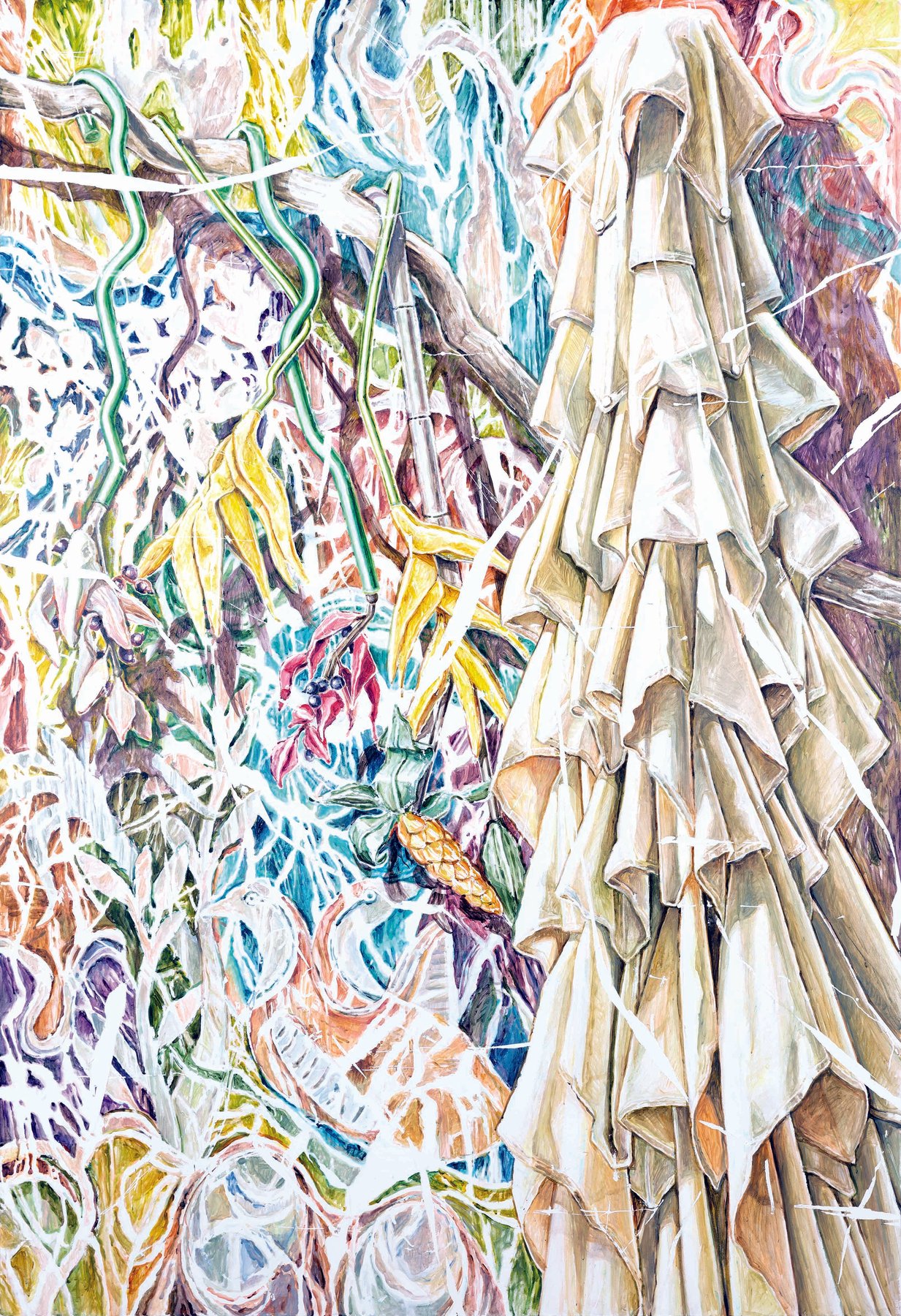 Picard’s take on the transience of life is conveyed through her elaborate depictions of the detritus weaved in colorful, yet muted background landscapes. Broken toys, hanging electrical cords, deflated balloons, and sun umbrellas are some of her favorite subjects. Sun umbrellas have a particular recurrence in her work – as is the feeling of being bleached by the sunlight that permeates her work.